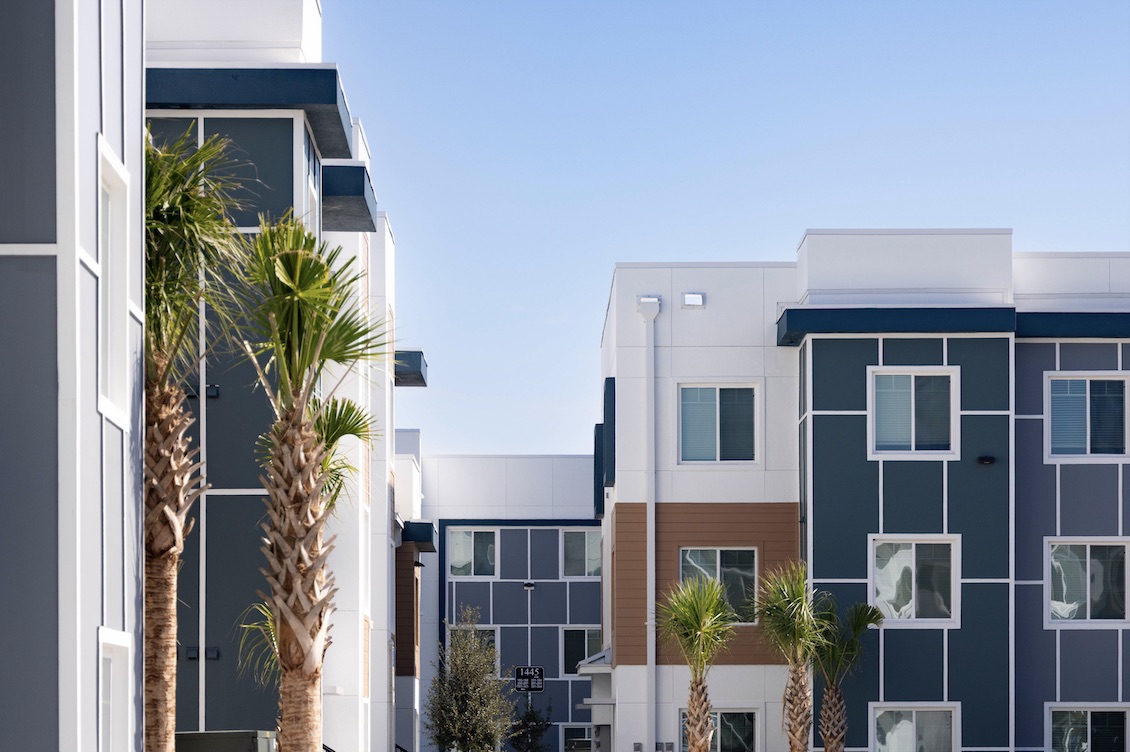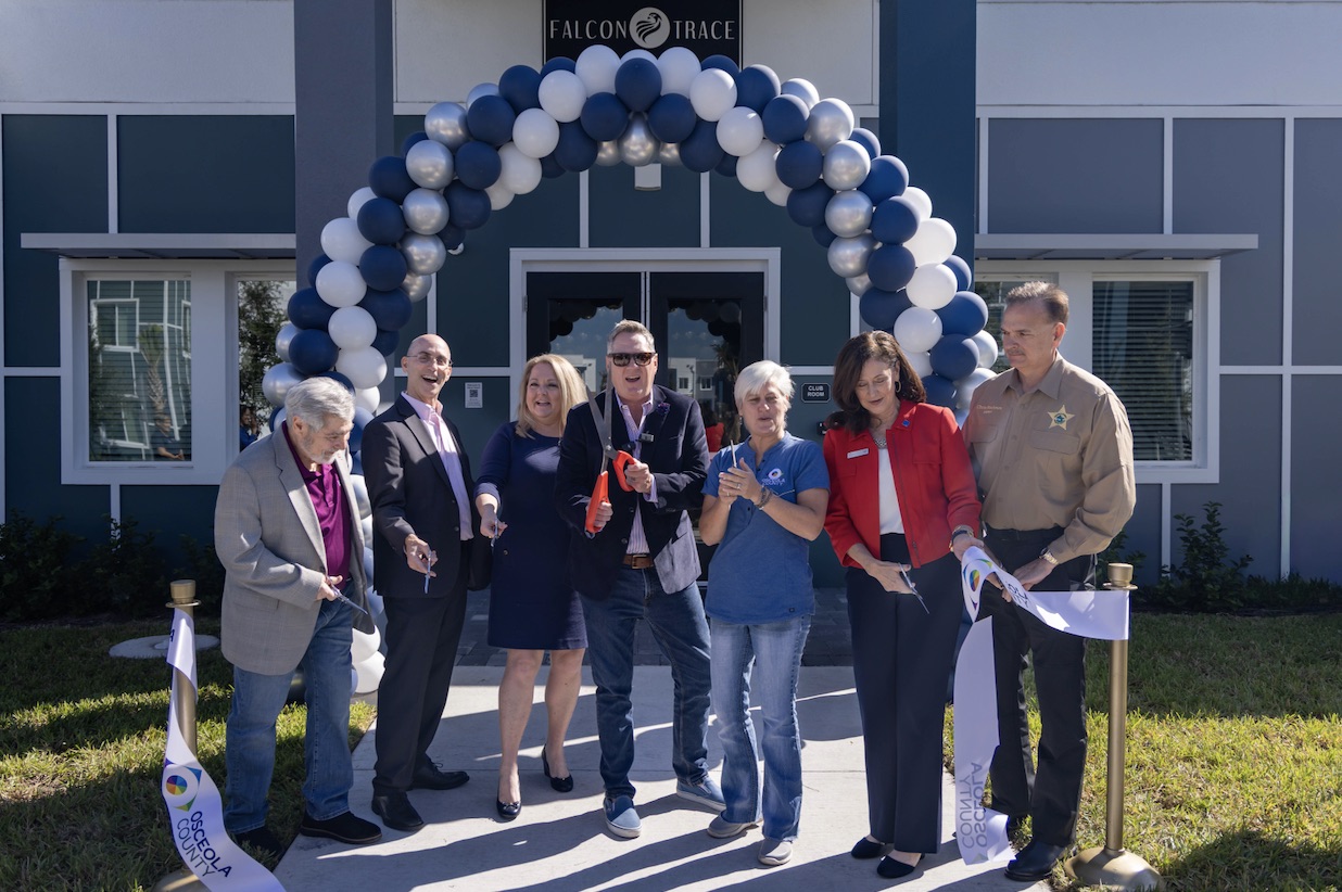 Osceola County Vice Chairman Brandon Arrington (C) is joined by Florida Housing Finance Corporation Board Member & Past Chairman Ron Lieberman (L); Birdsong Housing Partners CEO Steve Auger (2nd from L); JPMorgan Chase Community Development Banking Vice President Laura Myers (3rd from L); Osceola County Commissioner Cheryl Grieb (3rd from R); Bank of America Market Executive Senior Vice President Jodie Hardman (2nd from R); Osceola County Sherriff Chris Blackmon (R) at the Ribbon Cutting for the Falcon Trace II apartment complex.